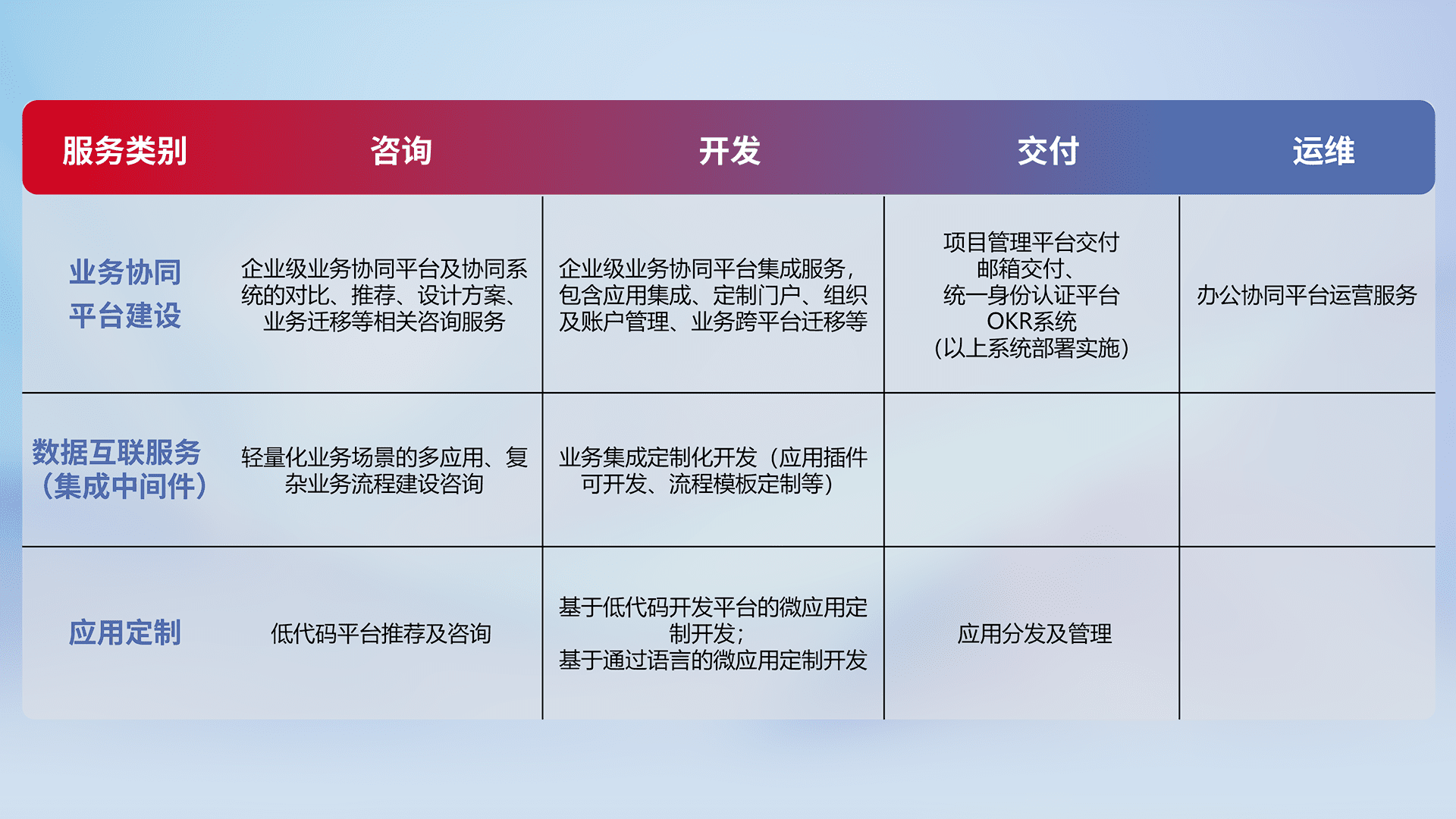 针对钉钉、、、、企微、、、、IDaas等平台级产品提供产品的规划、、、、方案、、、、交付、、定制化开发等服务,,,实现如统一协同办公、、智能客户服务、、混合会议管理、、智能数据查询、、等业务场景,,,,实现数字化转型。。。。